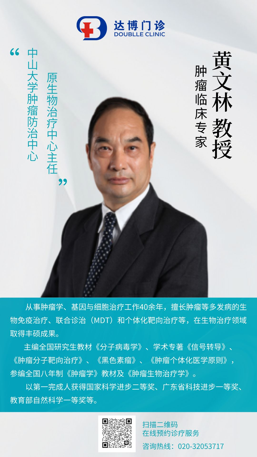 黃文林教授,達博門(mén)診創始人(rén),國內(nèi)頂尖腫瘤學與病毒學專家(jiā),​博​士生(shēng)導師(shī),中山(shān)大(dà)學腫瘤防治中心​二級教授,中山(shān)大(dà)學腫瘤防治中心原生(shēng)物治療中心主任,歐洲自然科學院院士,國家(jiā)特聘專家(jiā),國​家(jiā)新藥評審中心審評專家(jiā)、國家(jiā)重大(dà)項目評審專家(jiā),享受國務院政府​​特殊津貼,兼任973傳染病專項專家(jiā)組(十二五)專家(jiā)、亞太基因與細​胞治療協會(huì)輪值主席(2017)、​中國水(shuǐ)利電(diàn)力醫(yī)學科學技(jì)術(shù)學會(huì)名譽理(lǐ)​事長兼高(gāo)級家(jiā)(院士)委員會(huì)主任委員、中國醫(yī)藥生(shēng)物技(jì)術(shù)協​會(huì)基因​治療分會(huì)副主任委員、中國基因治療學會(huì)副理(lǐ)事長、香港中文大(dà)學榮譽​教授,廣州市十大(dà)留學回國​人(rén)才、廣州市創新創業領軍人(rén)才。主編全國​研究生(shēng)教材,為(wèi)《Human Gene Therapy》、《J. Virologica ​Sinica》等​多(duō)個(gè)雜志(zhì)的編委。曾任普林斯頓大(dà)學資深研究員,發表論文近200篇,主​編及參編著作(zuò)20餘本,​入選“全球頂尖前10萬科學家(jiā)”、“中國高(gāo)被引學者”。​黃教授從事腫瘤學、基因與細胞治療工作(zuò)40多(duō)年,擅長​腫瘤等多(duō)發病的生(shēng)​物免疫治療、聯合診治(MDT)和(hé)個(gè)體(tǐ)化靶向治療等,在生(shēng)物治療領域取​得(de)豐碩成果。