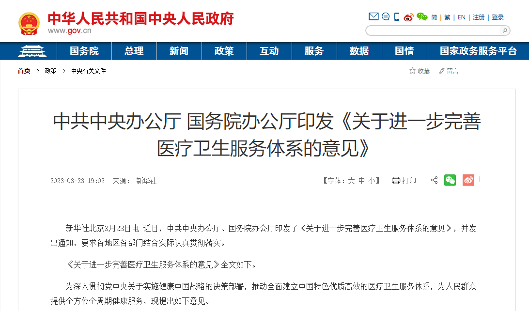 3月23日,中共中央辦公廳、國務院辦公廳印發了《關于進一步完善醫(yī)療衛生(shēng)服務體(tǐ)系的意見》,并發出通(tōng)知,要求各地區(qū)各部門(mén)結合實際認真貫徹落實。