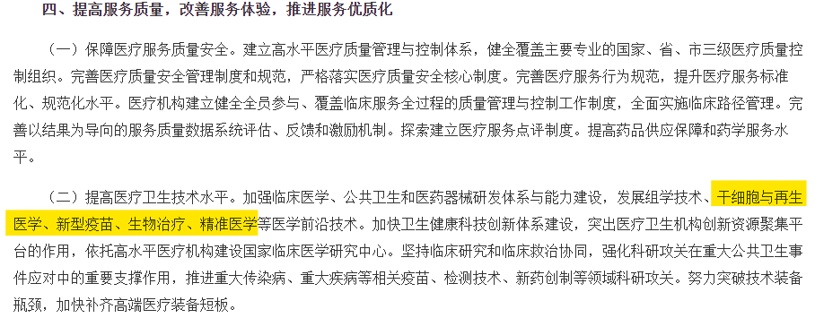 意見中明(míng)确提出:“提高(gāo)醫(yī)療衛生(shēng)技(jì)術(shù)水(shuǐ)平。加強臨床醫(yī)學、公共衛生(shēng)和(hé)醫(yī)藥器(qì)械研發體(tǐ)系與能力建設,發展組學技(jì)術(shù)、幹細胞與再生(shēng)醫(yī)學、新型疫苗、生(shēng)物治療、精準醫(yī)學等醫(yī)學前沿技(jì)術(shù)。加快衛生(shēng)健康科技(jì)創新體(tǐ)系建設,突出醫(yī)療衛生(shēng)機構創新資源聚集平台的作(zuò)用,依托高(gāo)水(shuǐ)平醫(yī)療機構建設國家(jiā)臨床醫(yī)學研究中心。堅持臨床研究和(hé)臨床救治協同,強化科研攻關在重大(dà)公共衛生(shēng)事件應對中的重要支撐作(zuò)用,推進重大(dà)傳染病、重大(dà)疾病等相關疫苗、檢測技(jì)術(shù)、新藥創制(zhì)等領域科研攻關。努力突破技(jì)術(shù)裝備瓶頸,加快補齊高(gāo)端醫(yī)療裝備短(duǎn)闆。”