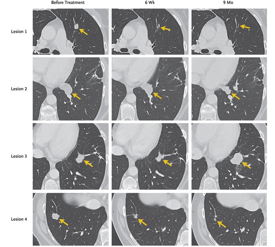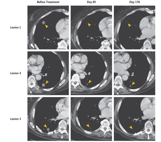 2016年頂級醫(yī)學雜志(zhì)《新英格蘭雜志(zhì)》上(shàng)報導的一款新型免疫療法震驚整個(gè)腫瘤界,因為(wèi)這款療法令緻命的晚期KRAS突變的結直腸癌患者肺部7個(gè)轉移病竈全部消退。