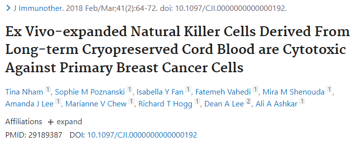 [1]Nham, Tina*; Poznanski, et,al.Ex Vivo-expanded Natural Killer Cells Derived From Long-term Cryopreserved Cord Blood are Cytotoxic Against Primary Breast Cancer Cells.doi: 10.1097/CJI.0000000000000192